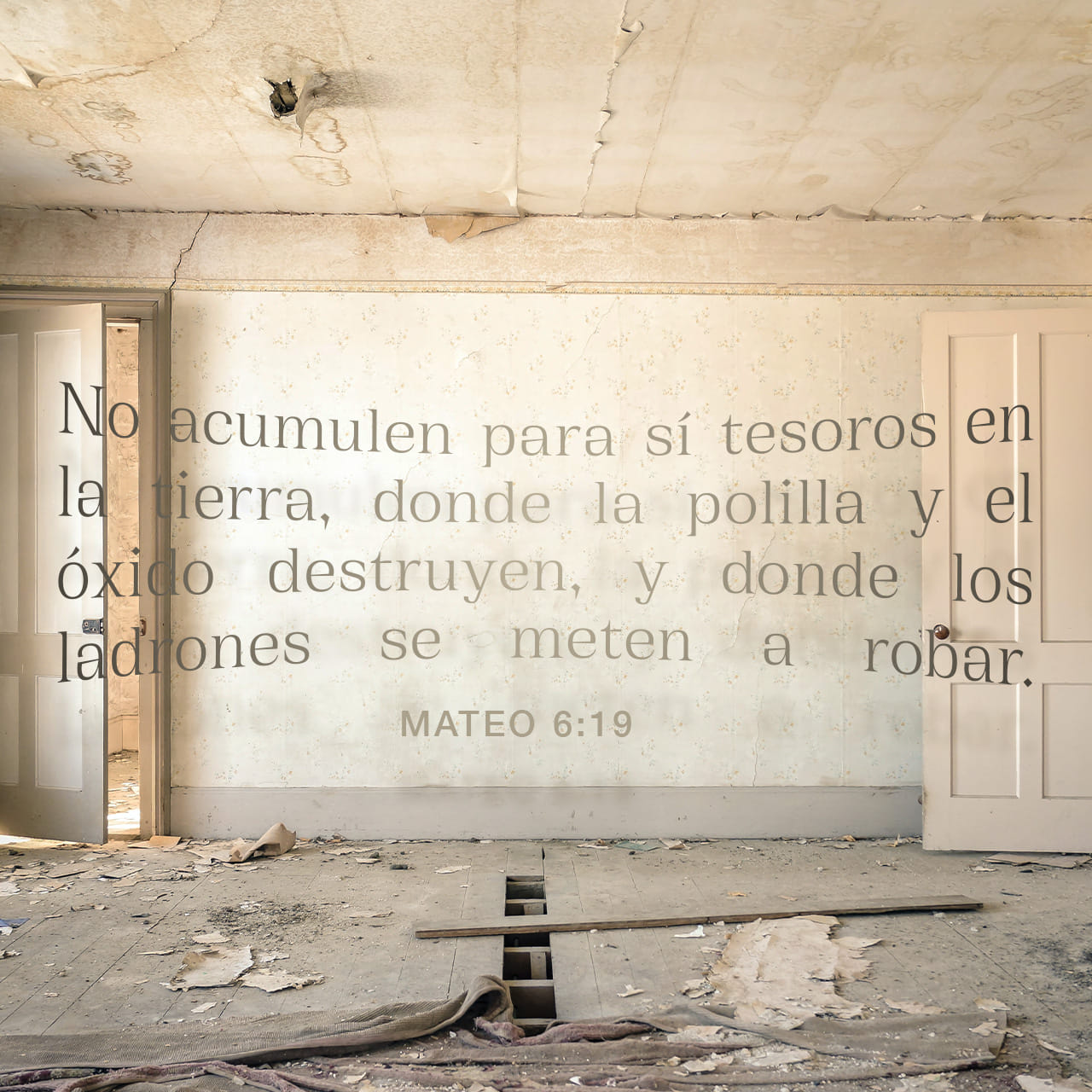 No guarden tesoros para ustedes aquí en la tierra, donde la polilla y el óxido los dañarán, y donde los ladrones entran a robárselos.